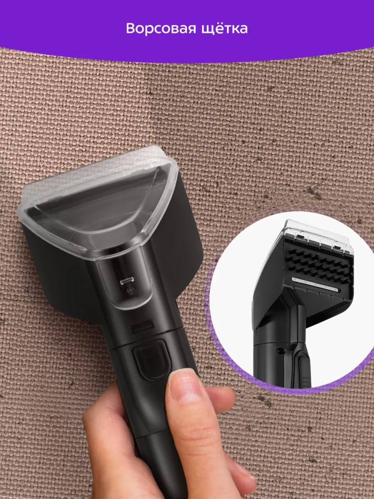 В комплекте поставляется насадка с ворсовой щеткой. Она хорошо подходит для очистки въевшихся загрязнений и ковровых покрытий. Крышка насадки и резервуар для грязной воды выполнены из прозрачного пластика, поэтому в процессе уборки хорошо видно, как много грязи собирает моющий пылесос.