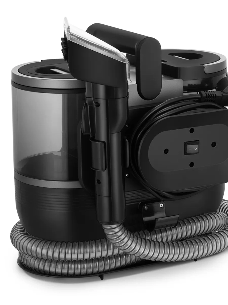 У моющего пылесоса есть держатели для шнура и шланга, поэтому его можно компактно сложить и удобно хранить.