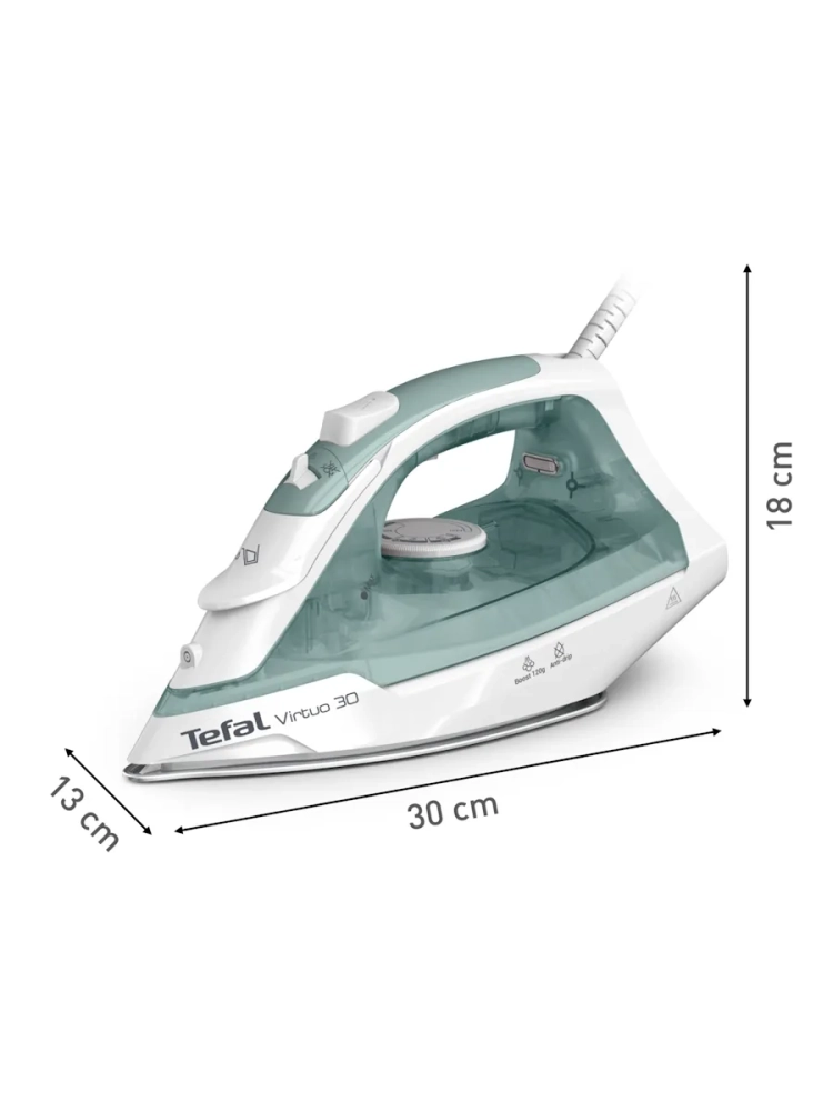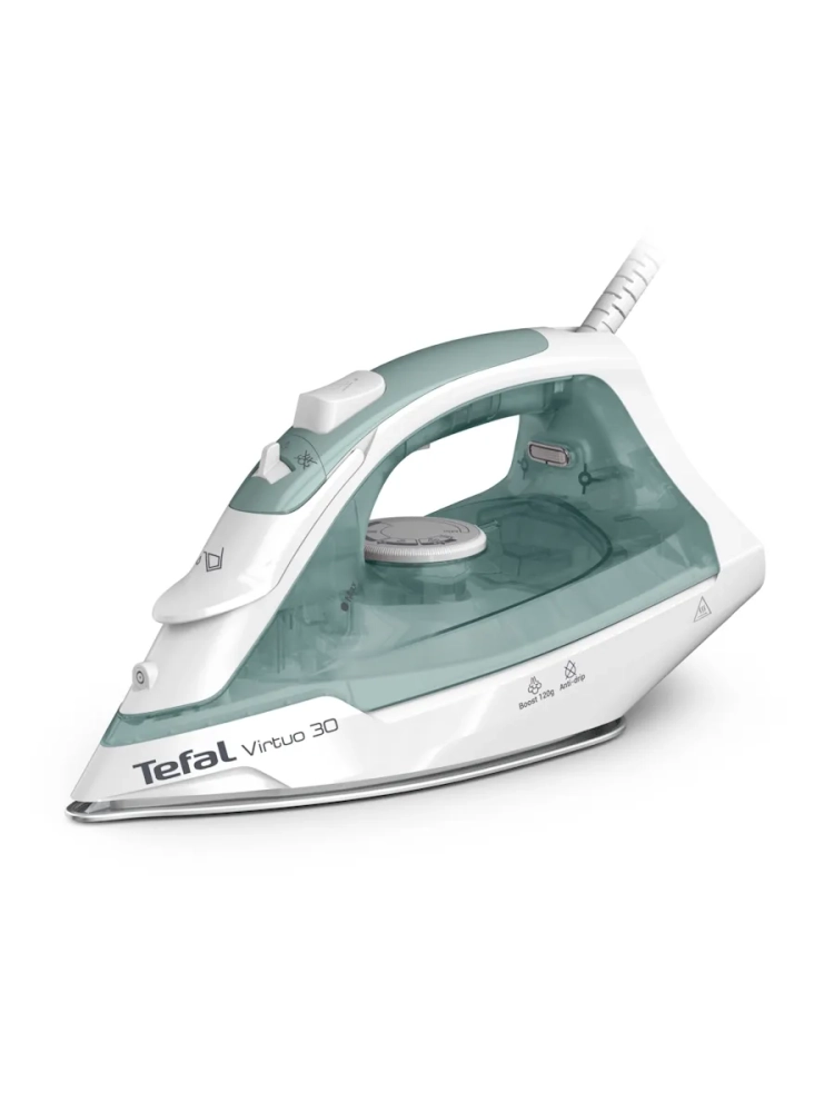Мощный паровой утюг для быстрого и эффективного ухода за одеждой Tefal представляет Virtuo 30, мощный паровой утюг, с которым вы легко добьетесь желаемого результата на любом типе ткани. Все самое необходимое для безупречного ухода за одеждой в одном приборе: керамическая подошва, противокапельная система, постоянная подача пара 27 г/мин, мощный паровой удар 120 г/мин, зауженный носик и многое другое.