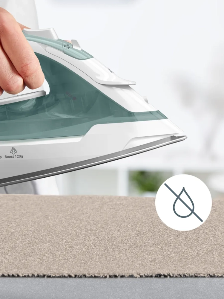 Встроенная противокапельная система предотвращает появление пятен и разводов на ткани в процессе глажения.