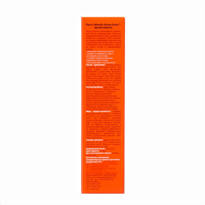 Способ применения: вымыть волосы шампунем Mirrolla Sulsen Forte. Тщательно втереть пасту массажными движениями в корни волос. Выдержать на волосах 5-10 минут, смыть тёплой водой.