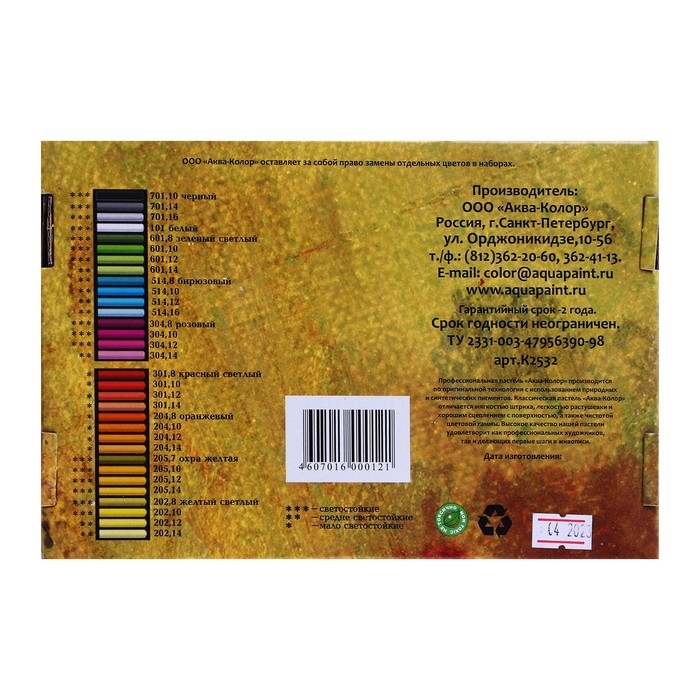 Использование в составе пастели гуммиарабика позволяет совмещать технику письма пастели и акварели. “Аква-Колор” производит пастель по оригинальной технологии с использованием природных и синтетических пигментов.