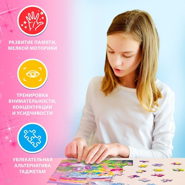 Пазл «Сказочные единороги» — это занимательная развивающая игра, которая стимулирует познавательную активность и помогает упорядочить мысли.