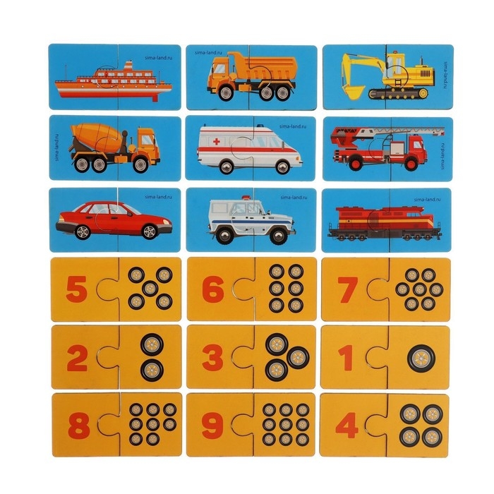Двусторонние пазлы позволят вашему ребёнку изучить две темы: счёт до 9 и транспорт.