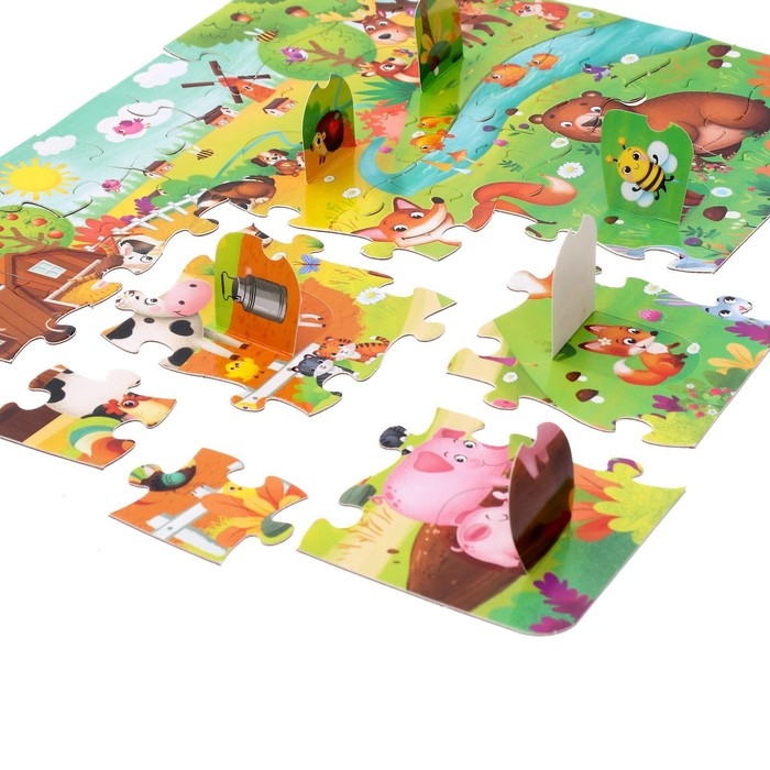В коробке 30 деталей, детали двух разных размеров. Обычные маленькие и большие детали с окошками внутри. Собрав все детали вы получите картинку размером 40 × 30 см.