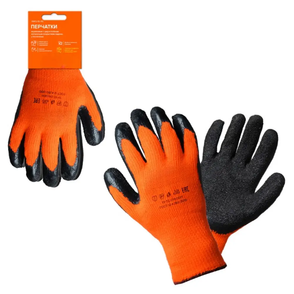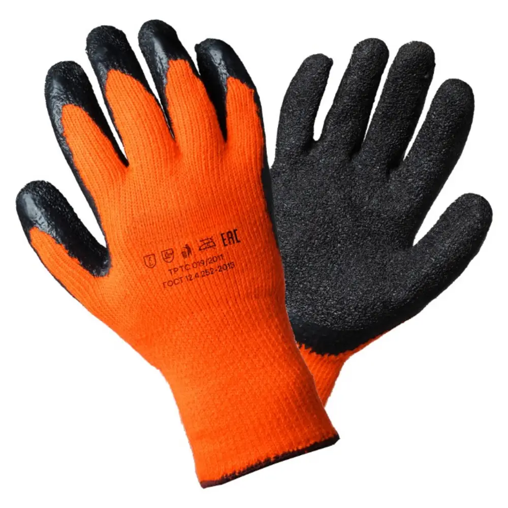 Применяются для защиты кистей рук от загрязнения, механических повреждений и различных жидкостей. Данная модель перчаток была разработана специально для работы при низких температурных условиях. Изделие имеет утепленную основу из трикотажа, а также покрытие из прочного латекса. Дополнительным элементом сохранения комфортной для работы температуры является наличие внутренней ворсистой поверхности. Кроме тепловых свойств, перчатки также помогают защитить кожу рук от повреждений при проведении ремонтных и строительных работ. Состав: акрил, латекс