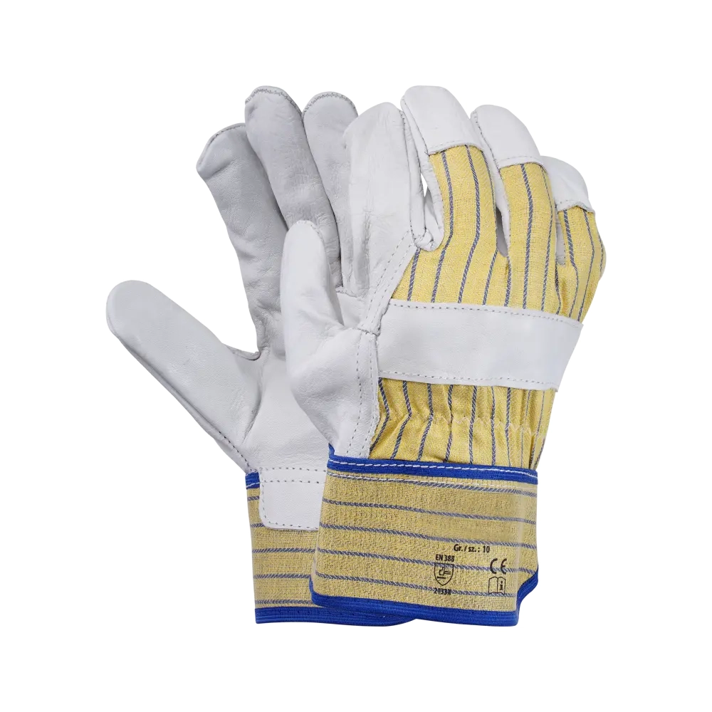 Перчатки комбинированные 0120 для защиты от механических воздействий комбинированные, плотная смесовая ткань с кожей КРС желтого (золотого) цвета, защитная крага (прорезиненный жесткий защитный манжет), на запястье резинка, двойные швы. Кожа КРС из спинной части шкур молодых телят, мягкая и растяжимая при значительной толщине 1,4 мм (+/– 0,2), сорт А+. Флисовая подкладка из хлопка на ладонной части и пальцах, имеет в серии Siberia специальную конструкцию обеспечивающую лучшую защиту пальцев от швов и комфорт. Перчатки обеспечивают высокий комфорт, и удобство манипулирования, высокий уровень защиты от истирания и разрыва, хорошие показатели защиты от пореза и прокола. Перчатки рекомендованы для продолжительного ношения, могут быть использованы для проведения общих работ для защиты от механических воздействий в отсутствии жидких загрязнителей, таких как масло, водные растворы и тд, для защиты рук от ОПЗ, истирания, при работе с инструментом.