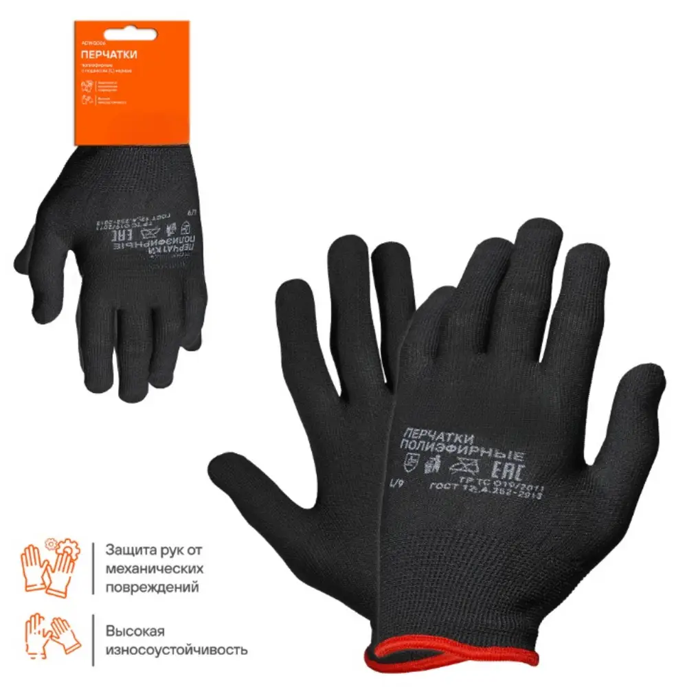 Применяются для защиты кистей рук от механических воздействий (истирания). Перчатки изготовлены из тонкого 100% полиэфира черного цвета, схожего с нейлоном. Перчатки отлично облигают руку, что повышает чувствительность и позволяет работать с мелкими предметами.
