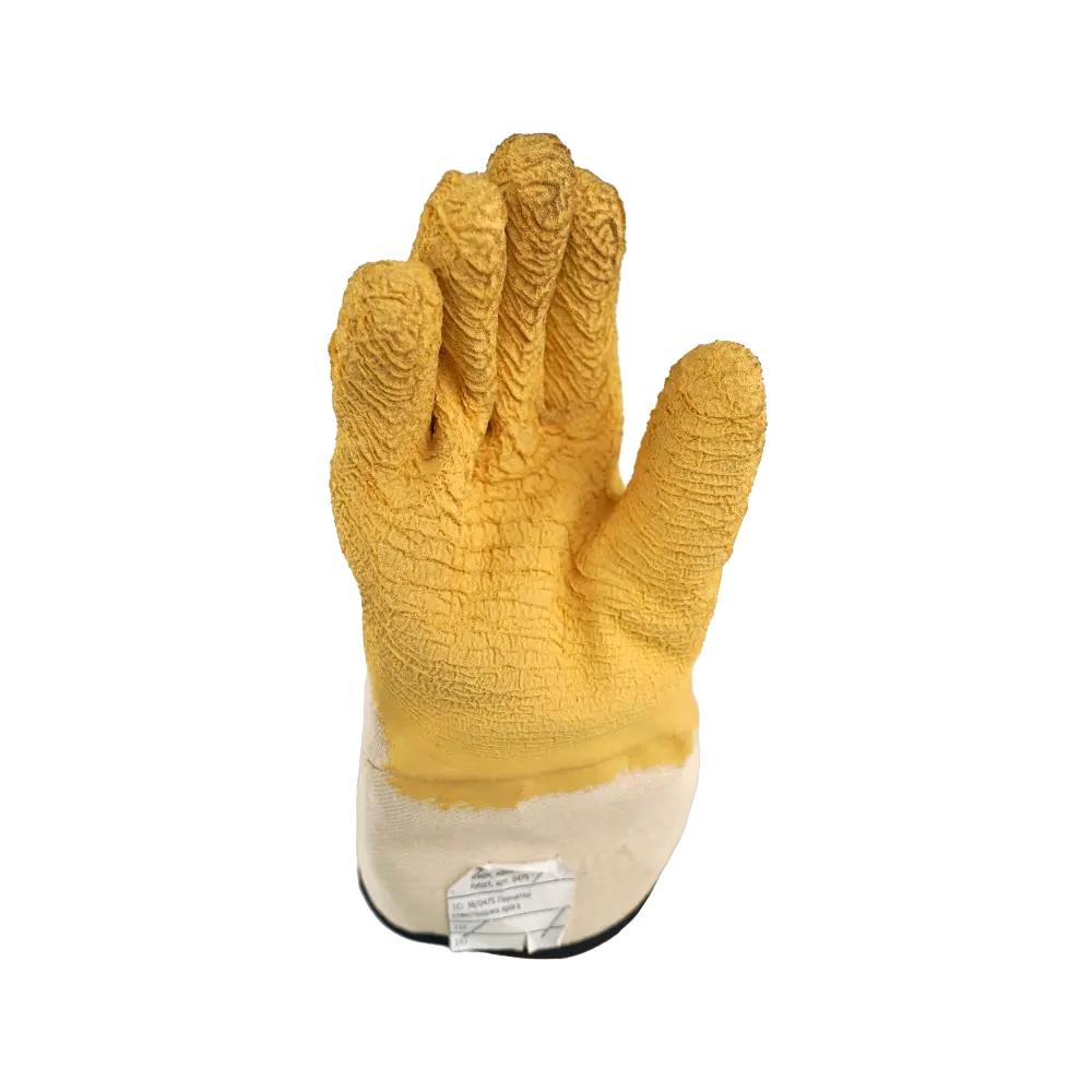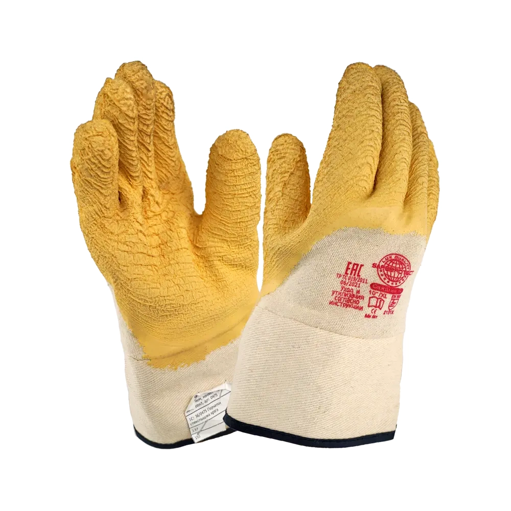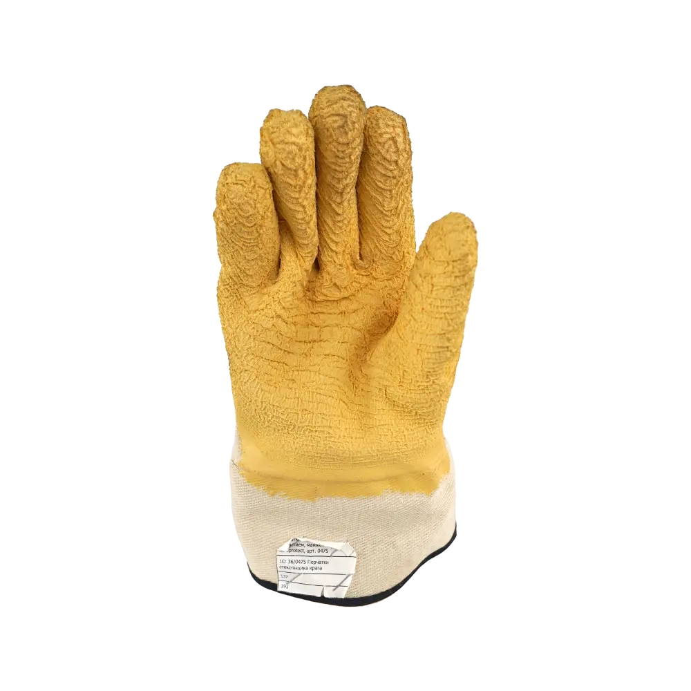 В основе перчаток 0475 –вязка из трикотажной х/б нити. Хлопчатобумажное сырье предотвращает появление аллергических реакций. У этого средства защиты нет швов. Рельефное покрытие достигается за счет нанесения двукратно на основу перчатки вспененного латекса. Это покрытие позволяет выполнять хороший захват во время деятельности со скользкими и гладкими поверхностями. Манжета – крага, которая позволяет в случае надобности быстро сбросить перчатку. Распространенная область использования перчаток 0475 – работа со стеклом.