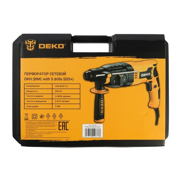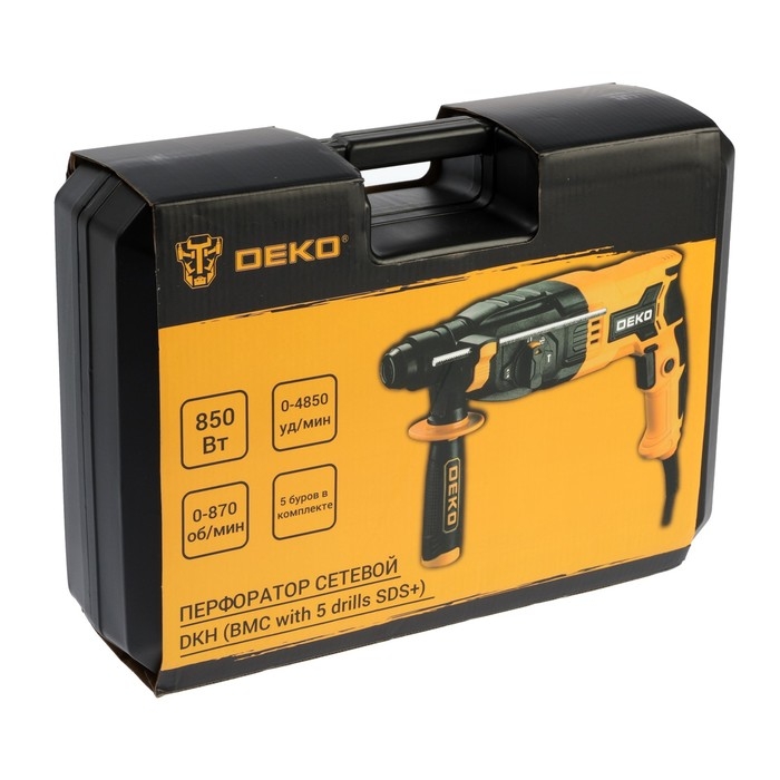 Перфоратор DEKO DKH, 850 Вт, SDS+, 4850 уд/мин, 3 Дж, кейс, набор из 5 буров