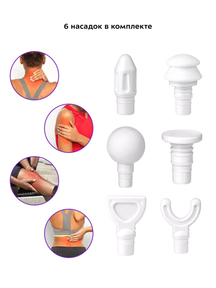 Насадки разных видов предназначены для воздействия на группы мышц и отдельные мышцы. Пулевидная насадка применяется для «разбивания» триггеров, проработки тканей и точечного массажа стоп. Y-насадка используется для массажа мышц шеи, трапеции, и мышц вдоль позвоночника. Плоская насадка отлично подходит для широких типов мышц. Круглая насадка более универсальная и проработает любые части тела. Насадка-лопатка используется на поясничной и пояснично-крестцовой области, спины и задней поверхности шеи, на икроножных мышцах или мышцах рук. Компрессионная насадка позволяет работать с самыми нежными и чувствительными мышцами, поскольку она силиконовая и полая внутри. Подходит для массажа живота, твердых частей и сухожилий вблизи суставов.