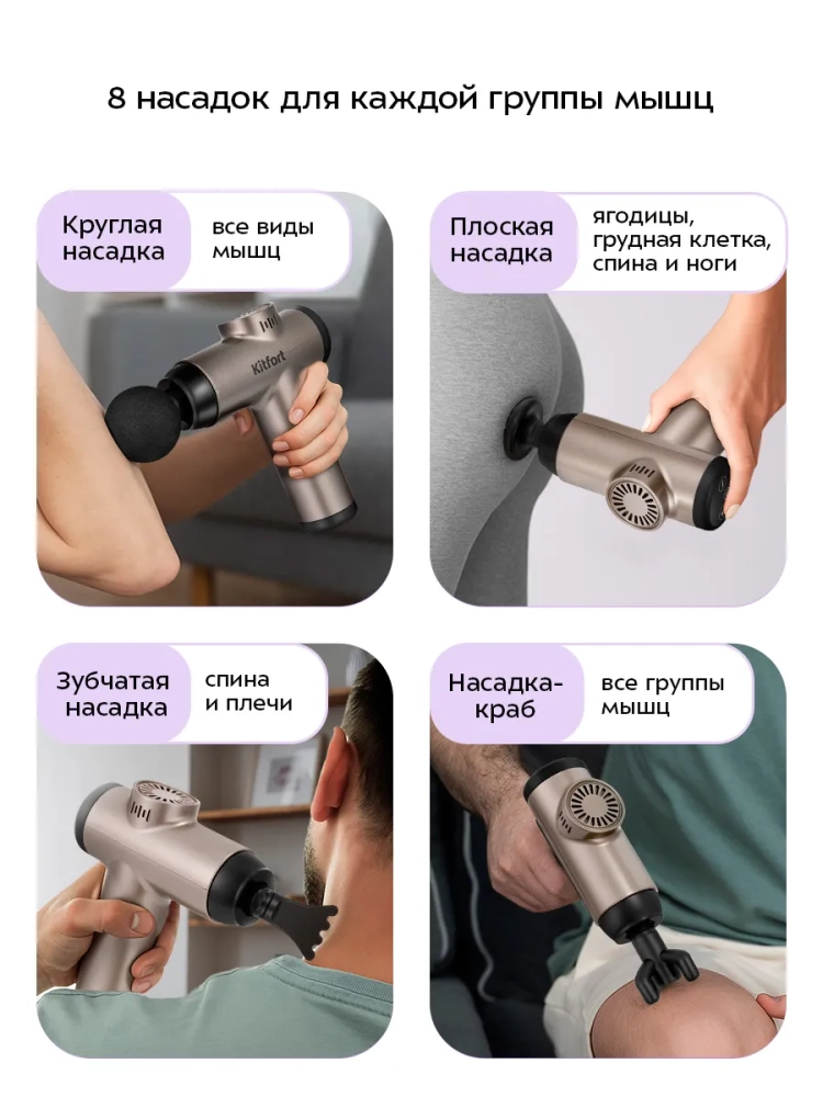 Насадки разных видов предназначены для воздействия на группы мышц и отдельные мышцы. Пулевидная насадка применяется для «разбивания» триггеров, проработки тканей и точечного массажа стоп. Пулевидная насадка действует на проблемные зоны, прорабатывает триггеры и помогает расправить зажатые фасциальные волокна. Y-насадка используется для массажа мышц шеи, трапеции и мышц вдоль позвоночника. Плоская насадка отлично подходит для широких мышц туловища. Круглая насадка более универсальная и подходит почти для любых групп мышц. Пальцевидная насадка подходит для точечной проработки малых мышечных групп, кисти, стопы. Дугообразная насадка нужна для работы с мышцами рук, бедер, с икроножными мышцами и для акупунктурного массажа стоп. Зубчатая насадка используется для проработки мышц спины и плеч. Насадка-краб подходит для расслабляющего массажа мышц всего тела.