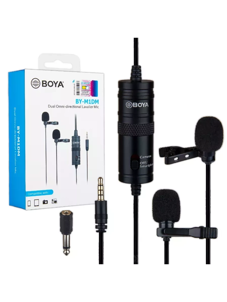 Микрофонный комплект BOYA BY-M1DM – оборудование профессионального класса, которое может быть полезно журналистам и другим пользователям, уделяющим серьезное внимание качеству записи звука. В частности, комплект отлично подходит для интервью. Совместимое оборудование – смартфоны, планшеты, камеры, диктофоны и другая техника, допускающая подключение внешних микрофонов.Микрофонный комплект BOYA BY-M1DM состоит из пары всенаправленных петличных микрофонов, чувствительность которых равна -30 дБ. Длина аудиокабеля значительна – 4 м. Микрофоны подключаются с помощью разъемов мини-джек или jack 6.3 мм (последняя возможность гарантируется благодаря наличию в комплекте переходника). Источник питания устройства – миниатюрная батарейка LR44. Для хранения и транспортировки микрофонов удобно использовать комплектный чехол.
