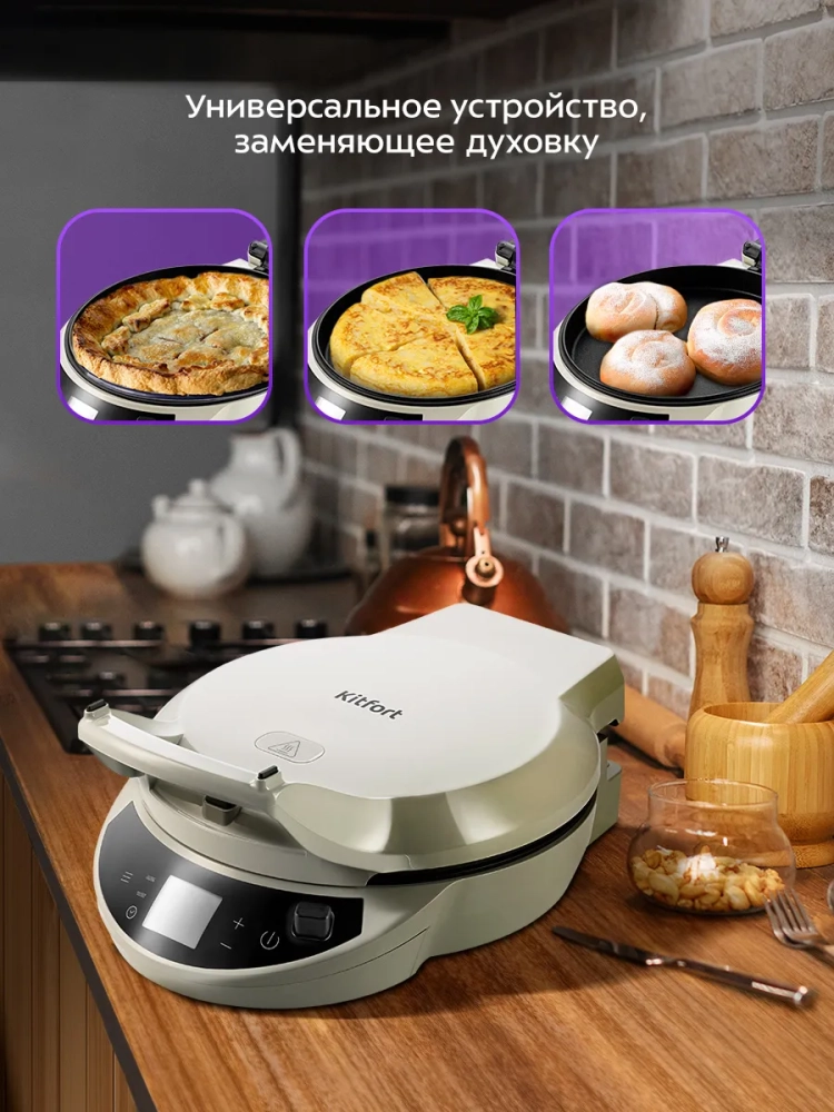 Пиццамейкер «3 в 1» Kitfort KT-4638 идеально подходит для приготовления пиццы, различных пирогов, датских пончиков, булочек, сырников, горячих бутербродов и запеканок. Также в пиццамейкере можно готовить омлет, запеченные овощи, котлеты, мясо, рыбу и многое другое.
