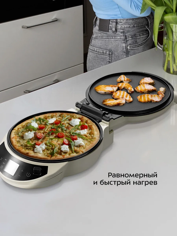 За счет нагревательных элементов в обеих панелях и небольшого пространства между панелями нагрев происходит быстро и равномерно. Поэтому блюда не пригорают снизу или сверху и хорошо пропекаются внутри. Благодаря равномерному нагреву пицца получается сочной со слегка хрустящей корочкой.