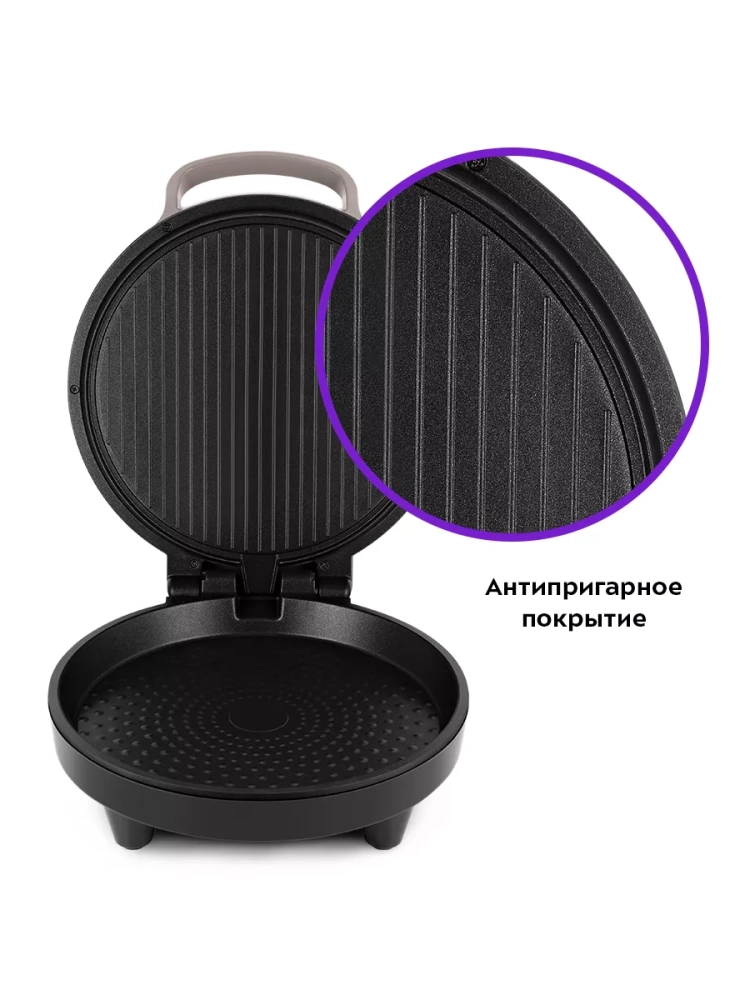Антипригарное покрытие помогает не прилипать тесту и другим продуктам в процессе приготовления и позволяет готовить с минимальным количеством масла или без него. Также антипригарное покрытие панелей облегчает чистку, что особенно важно, так как панели являются несъемными. Пиццамейкер оснащен индикаторами питания и нагрева, термостатом для регулировки и поддержания температуры панелей и таймером. Прорезиненные ножки не дают прибору скользить по столу во время готовки.