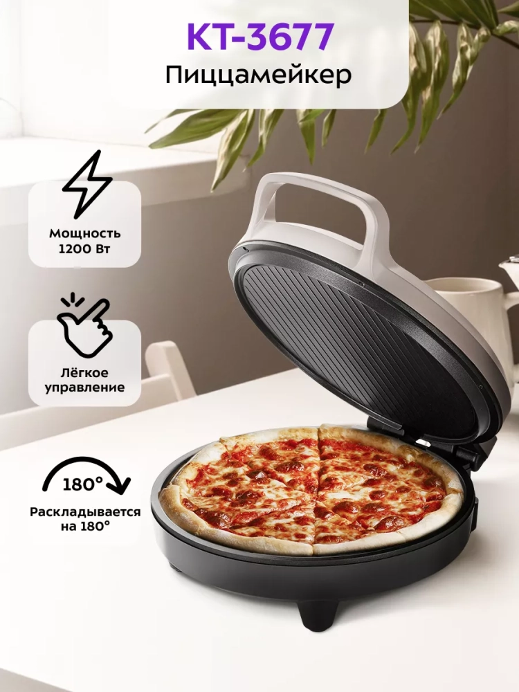 Пиццамейкер Kitfort KT-3677 — универсальное устройство, способное заменить духовку. Идеально подходит для приготовления пиццы, различных пирогов, сырников, горячих бутербродов и запеканок. Также в пиццамейкере можно готовить омлет, запеченные овощи, котлеты, мясо, рыбу и многое другое.