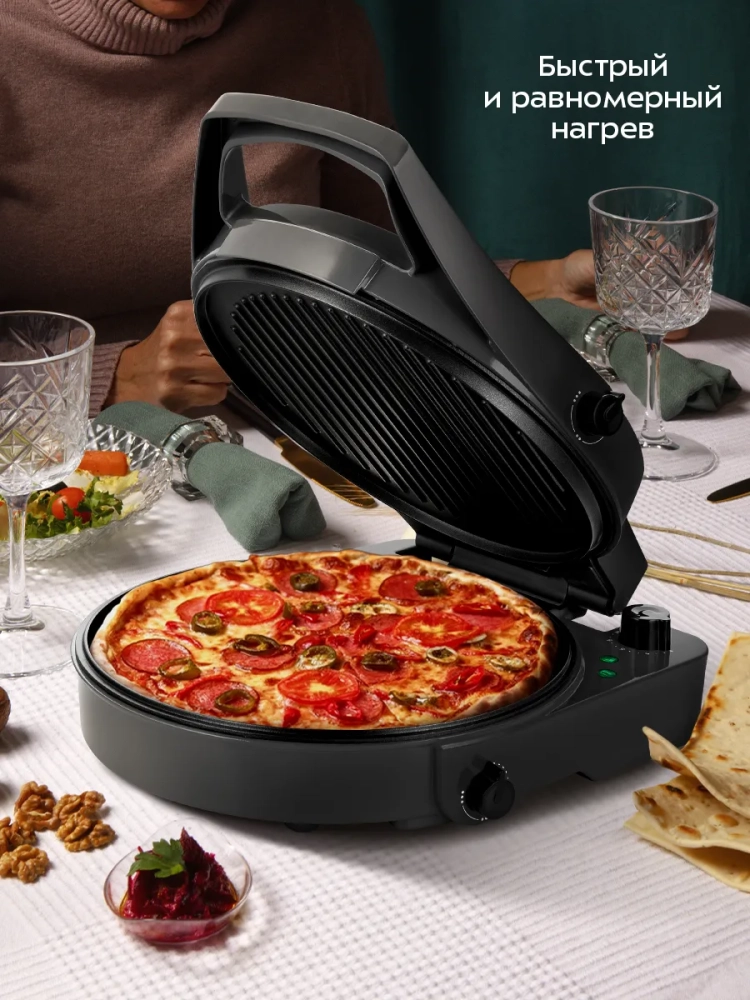 За счет нагревательных элементов в обеих панелях и небольшого пространства между панелями нагрев происходит быстро и равномерно. Поэтому блюда не пригорают снизу или сверху и хорошо пропекаются внутри. Благодаря равномерному нагреву пицца получается сочной со слегка хрустящей корочкой.