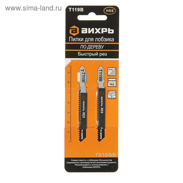 Пилки для лобзика "Вихрь" Т119В, по дереву, быстрый рез, 77 х 50 мм, 2 шт.