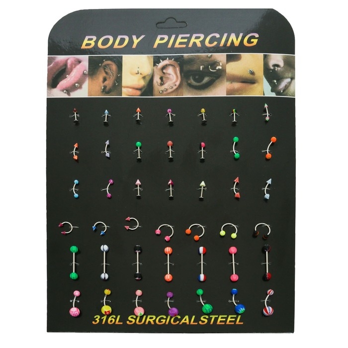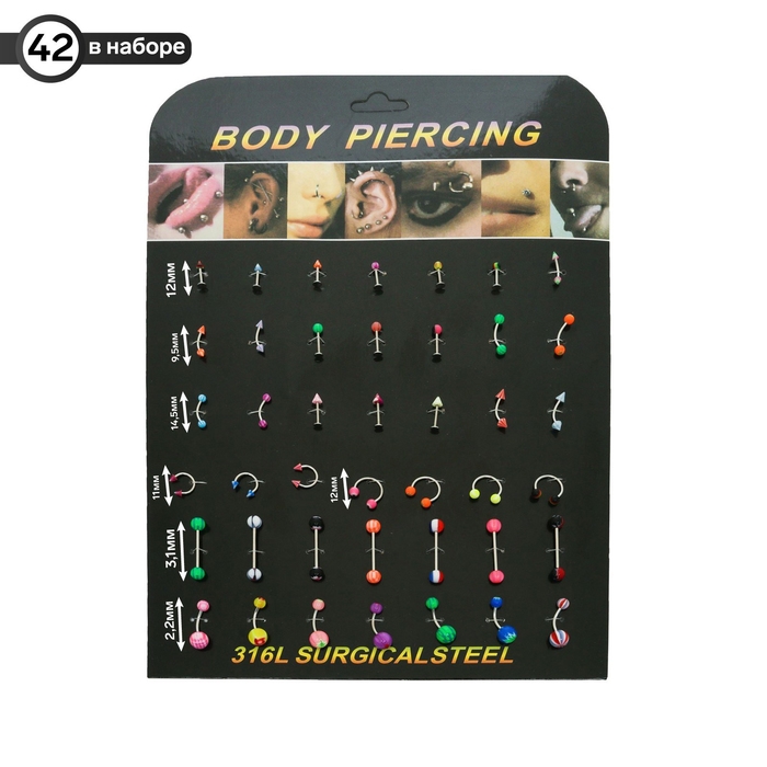 Пирсинг набор, 42 шт., форма МИКС, цвет МИКС в серебре