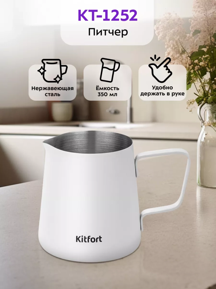 Питчер Kitfort КТ-1252 — специальная емкость для взбивания молока для капучино и латте, железные стенки которой позволяют чувствовать температуру молока, что важно для процесса приготовления (если перегреть молоко, оно не будет взбиваться, даже если остынет). Вы также можете использовать питчер в качестве молочника или кувшина для других напитков.