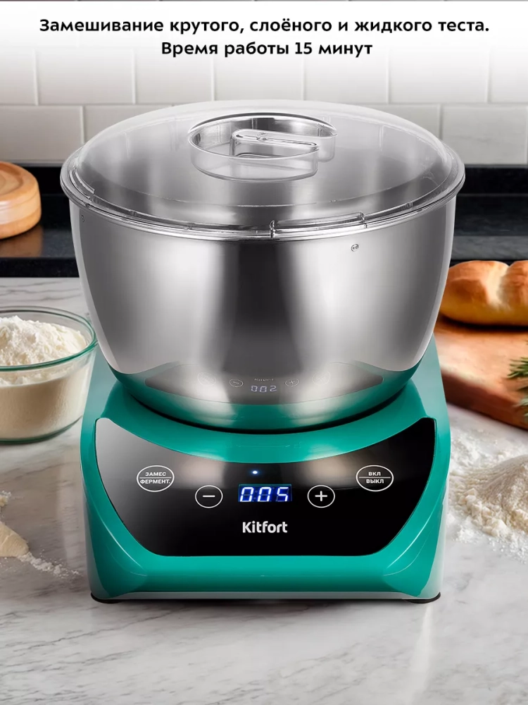 Тестомесильная машина Kitfort КТ-3476 — это идеальный помощник для вашей кухни, который облегчит процесс приготовления теста. Этот профессиональный электрический прибор оснащен мощным двигателем на 550 Вт, что позволяет быстро и качественно замешивать тесто для пельменей, пирогов и булочек. Благодаря планетарному движению насадки, тесто смешивается в тестомешалке равномерно без комков. Эта кухонная техника имеет удобную сенсорную панель управления с дисплеем, где отображается время работы прибора. Вы можете выбрать автоматический режим работы: просто добавьте ингредиенты в чашу объемом 5 литров из нержавеющей стали и установите время замеса от 5 до 15 минут с шагом в 2 минуты. После завершения процесса прибор подаст звуковой сигнал. Чаша также подходит для расстойки теста благодаря функции нагрева от 30 до 40 °С. Это позволяет сахару и другим ингредиентам лучше взаимодействовать во время подъема теста. Время ферментации можно установить от 10 минут до часа и сорока пяти минут с шагом в десять минут. Прорезиненные ножки обеспечивают устойчивость прибора на столе во время работы, а защитная крышка предотвращает разбрызгивание ингредиентов при замешивании. Максимальное время непрерывной работы гаджета составляет пятнадцать минут; после этого рекомендуется дать мотору остыть не менее тридцати минут. Этот многофункциональный бытовой тестомес Китфорт станет незаменимым электро устройством на вашей кухне благодаря своей надежности и функциональности.