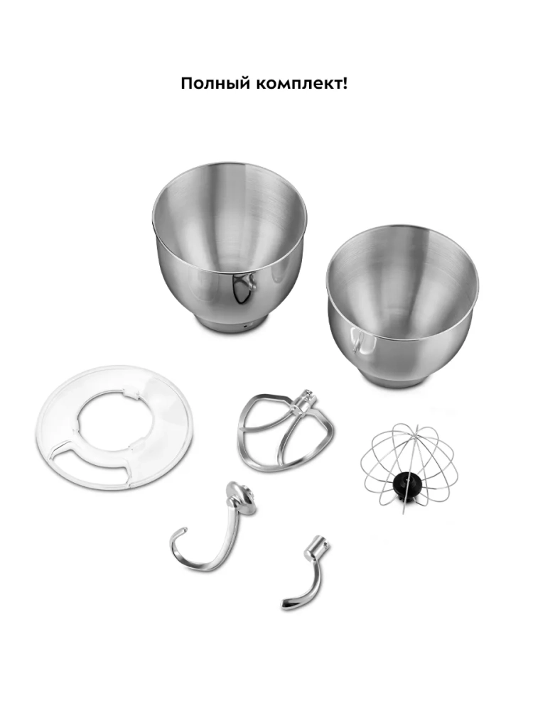 Планетарный миксер кухонный Kitfort КТ-4406 — это мощный прибор, который станет незаменимым помощником на вашей кухне. С его помощью вы сможете легко смешать ингредиенты, взбить яичный белок или сливки, приготовить соус, крем или мусс. Этот тестомес идеально подходит для замешивания жидкого теста для блинов и густого теста для пельменей и пирогов. Миксер оснащен двумя чашами объемом 6 и 7 литров из нержавеющей стали. Эти прочные чаши позволяют смешивать даже горячие ингредиенты. Вы можете выбрать подходящую чашу для приготовления в зависимости от объема продуктов. Чаша надежно закрепляется на моторном блоке и снабжена защитной крышкой с загрузочным отверстием, что предотвращает разбрызгивание при замешивании. В комплект входят венчик для взбивания яичных белков и сливок, насадка для смешивания негустых ингредиентов (например, картофельного пюре или томатной пасты), а также два крюка для замешивания густого теста. Планетарная система смешивания обеспечивает равномерное распределение всех компонентов. Этот планетарный миксер может работать в автоматическом режиме: достаточно положить ингредиенты в чашу и выбрать нужную скорость работы из шести доступных режимов. Также предусмотрен режим «Подогрев», который подогревает содержимое до 38 °С — идеальная температура для расстойки теста прямо в чаше. Прибор оснащен системой безопасности : он автоматически выключается при откидывании моторного блока или перегреве двигателя. Мощность kitchen многофункционального устройства Китфорт составляет 1900 Вт, что позволяет справляться с любыми задачами в готовке быстро и эффективно.