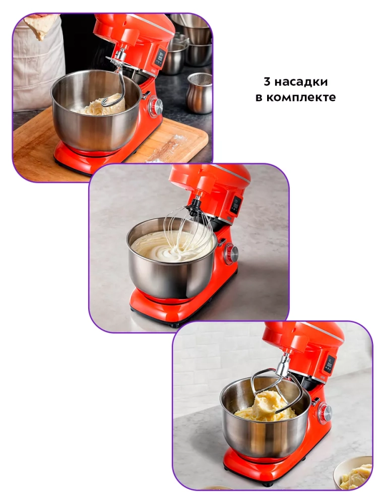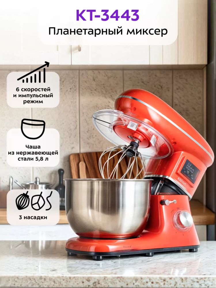 Планетарный миксер Kitfort КТ-3443 поможет вам смешать ингредиенты, взбить яичный белок или сливки, приготовить картофельное пюре, соус, крем, мусс, замесить жидкое тесто для блинов и крутое — для пельменей и пирогов. В комплекте есть три насадки.