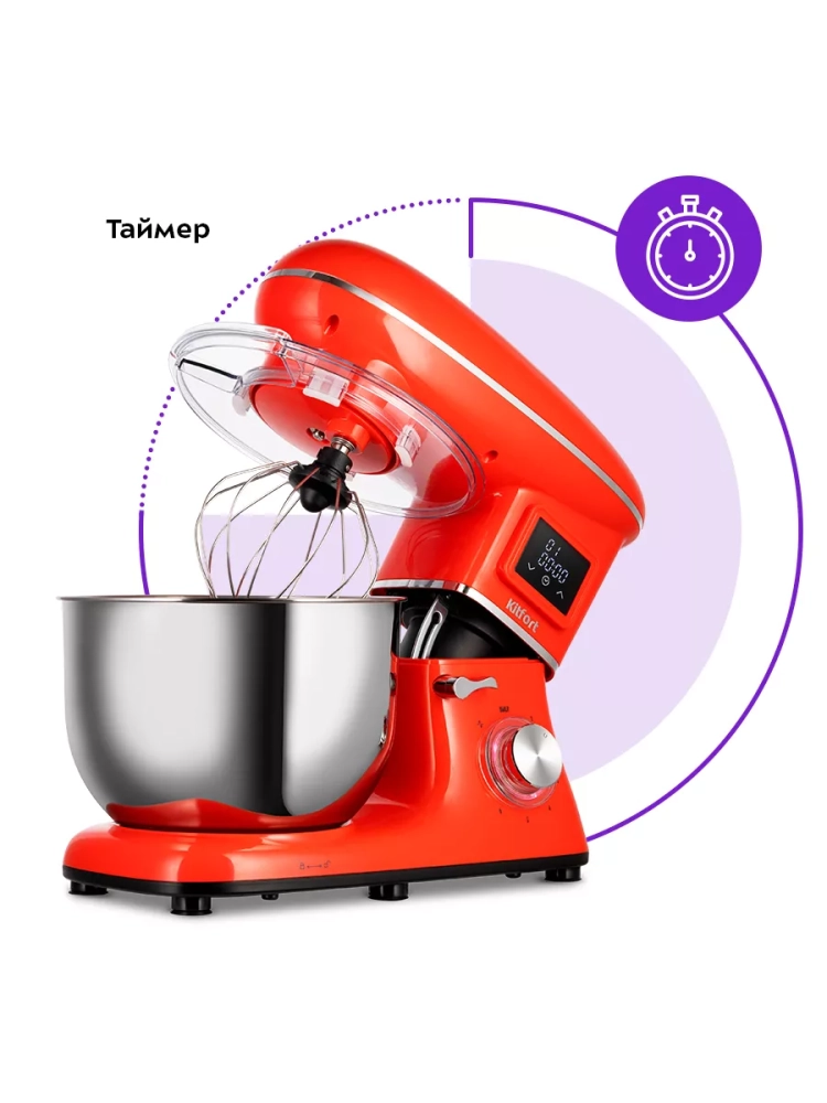 Миксер оснащен таймером прямого и обратного отсчета. По таймеру прямого отсчета вы можете засечь время, которое требуется для взбивания, смешивания или замешивания ингредиентов, а в следующий раз сразу выставить это время на таймере обратного отсчета. Таймер обратного отсчета позволяет установить время работы миксера — от 5 секунд до 90 минут с шагом 5 секунд. По истечении выставленного времени миксер автоматически выключится.