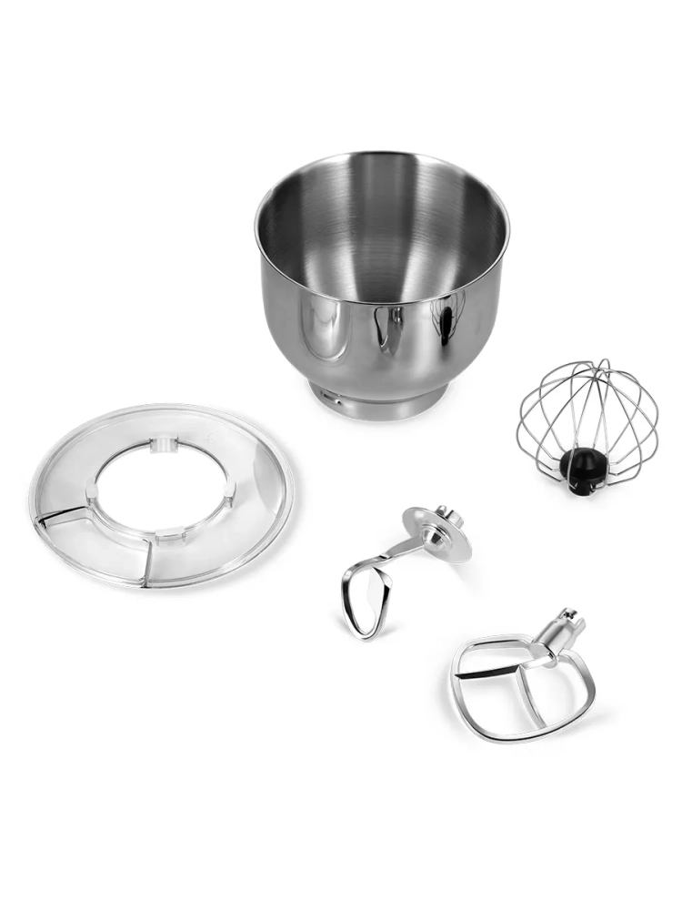 Венчик служит для взбивания яичных белков, сливок, замешивания жидкого теста. Насадка для смешивания используется для негустых ингредиентов, приготовления картофельного пюре, томатной пасты, кондитерских смесей или теста для тортов. Крюк для замешивания подойдет для замешивания густого теста.