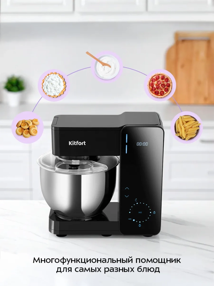 Планетарный миксер KitfortКТ-4429 поможет вам смешать ингредиенты, взбить яичный белок или сливки, приготовить картофельное пюре, соус, крем, мусс, замесить жидкое тесто для блинов и крутое — для пельменей и пирогов. В комплекте есть венчик для взбивания, насадка для смешивания и крюк для замешивания.