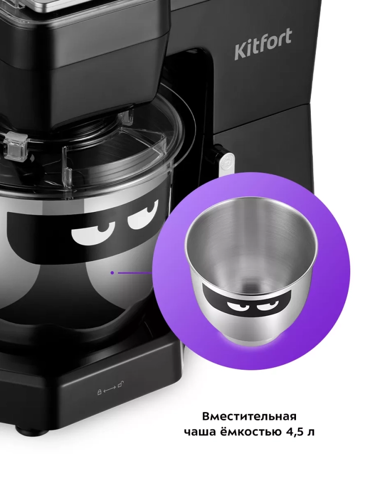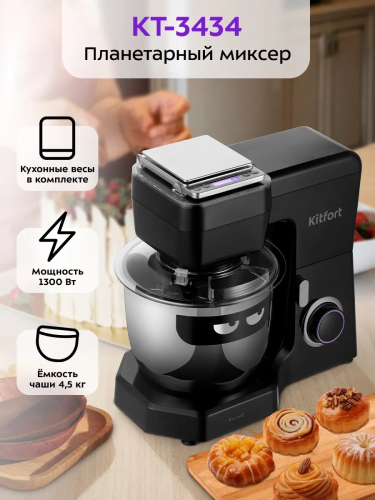 Планетарный миксер Kitfort КТ-3434 поможет вам смешать ингредиенты, взбить яичный белок или сливки, приготовить картофельное пюре, соус, крем, мусс, замесить жидкое тесто для блинов и крутое — для пельменей и пирогов. В комплекте есть три насадки.