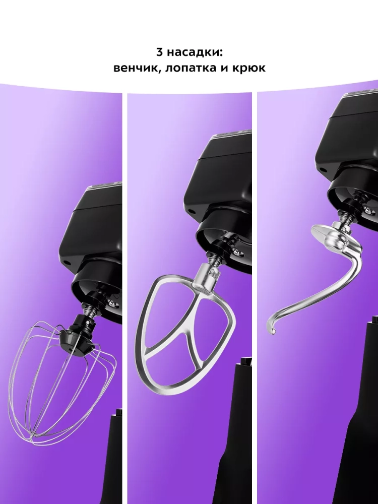 Венчик служит для взбивания яичных белков, сливок, замешивания жидкого теста. Насадка для смешивания используется для негустых ингредиентов, приготовления картофельного пюре, томатной пасты, кондитерских смесей или теста для тортов. Крюк для замешивания подойдет для замешивания густого теста.