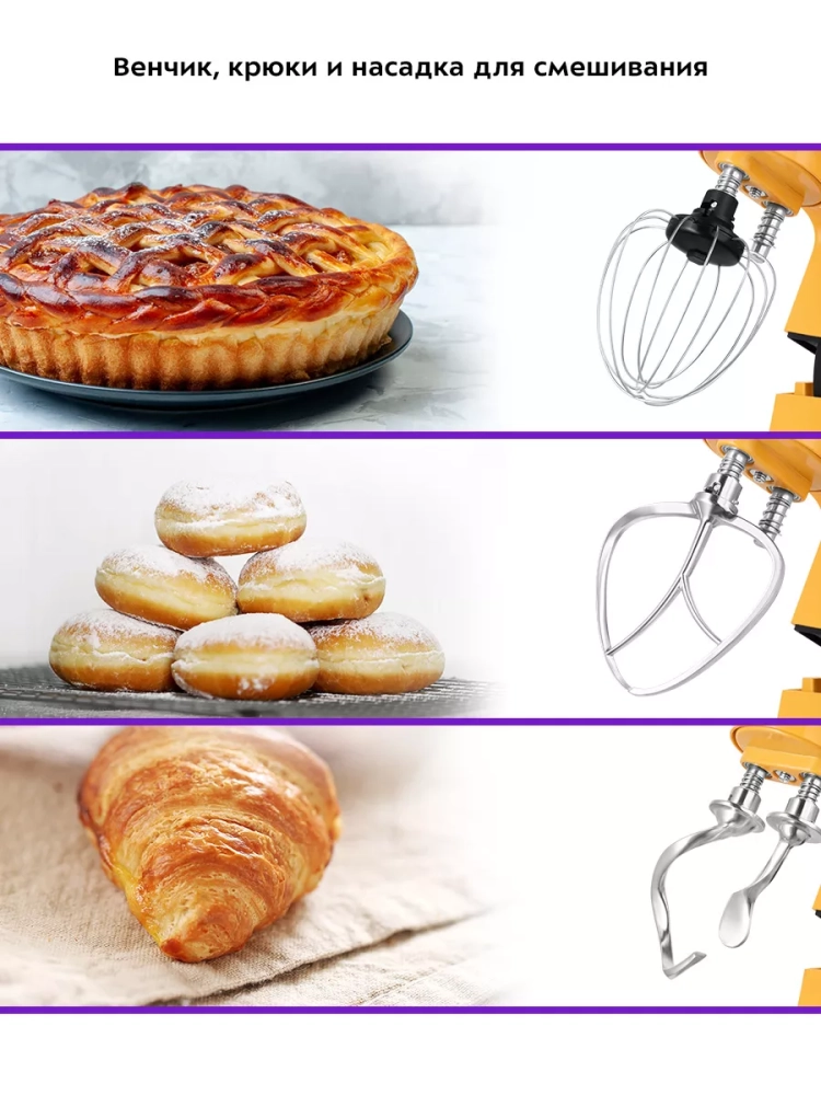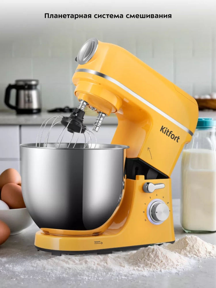 Многофункциональный планетарный миксер Kitfort КТ-3458 (3 в 1) поможет вам смешать ингредиенты, взбить яичный белок или сливки, приготовить картофельное пюре, соус, крем, мусс, замесить жидкое тесто для блинов и крутое для пельменей и пирогов.