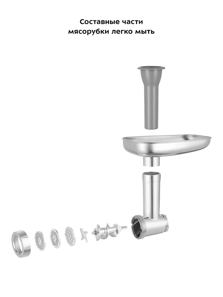 В комплекте идут венчик для взбивания, насадка для смешивания и приготовления пюре, крюки для замеса крутого теста, а также защитный кожух, который защищает шпиндель от налипания продуктов.
