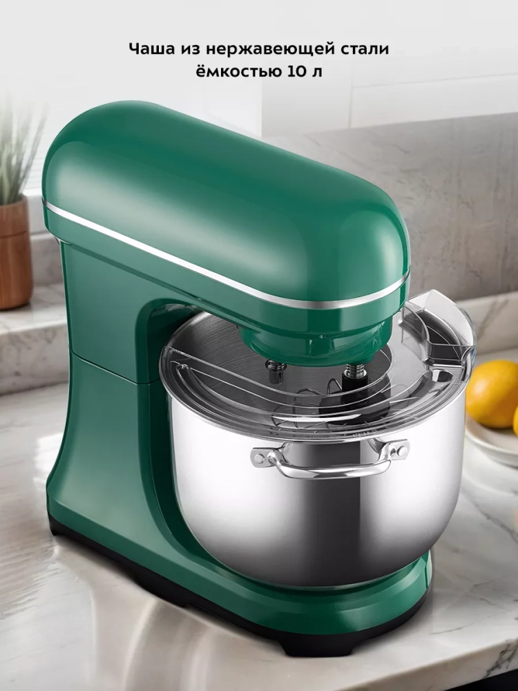 Миксер оснащен чашей емкостью 10 литров. Чаша изготовлена из нержавеющей стали, она прочная, и в ней можно смешивать даже горячие ингредиенты. Для удобства на чаше есть ручки для переноски.