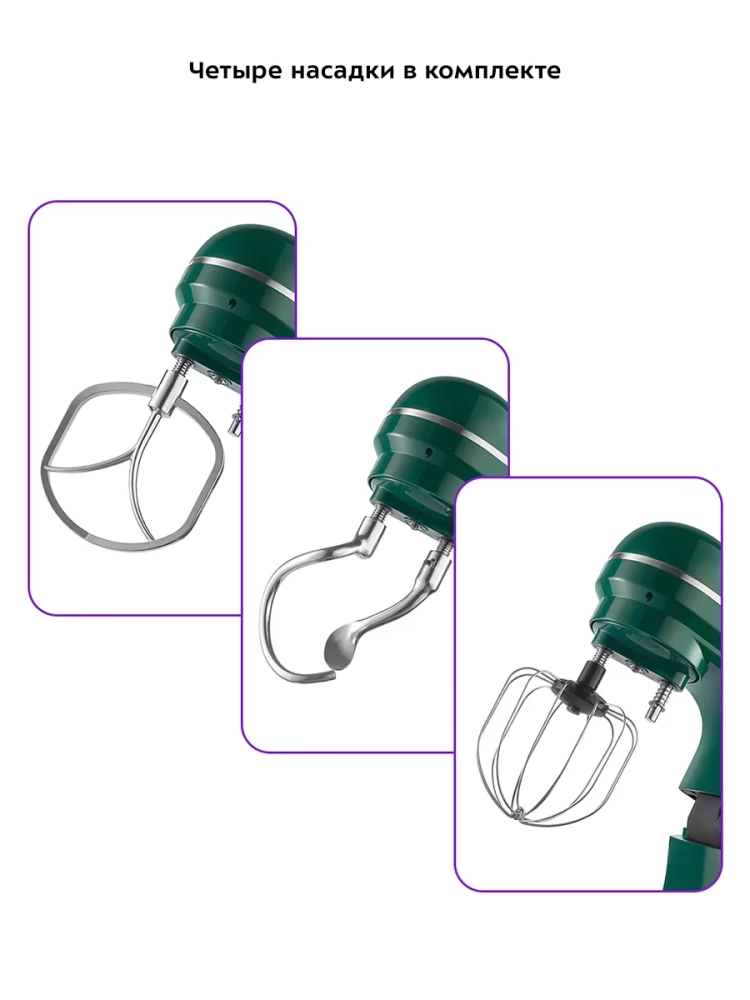 Венчик служит для взбивания яичных белков, сливок, замешивания жидкого теста. Насадка для смешивания используется для негустых ингредиентов, приготовления картофельного пюре, томатной пасты, кондитерских смесей или теста для тортов. Большой и малый крюки для замешивания подойдут для замешивания густого теста.