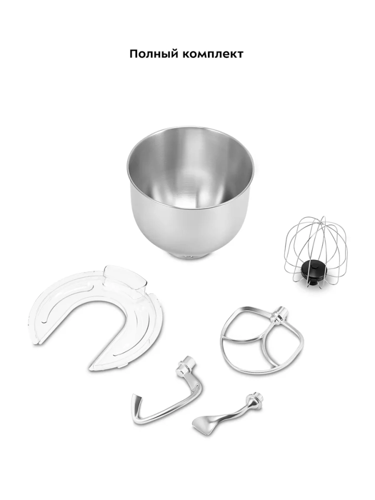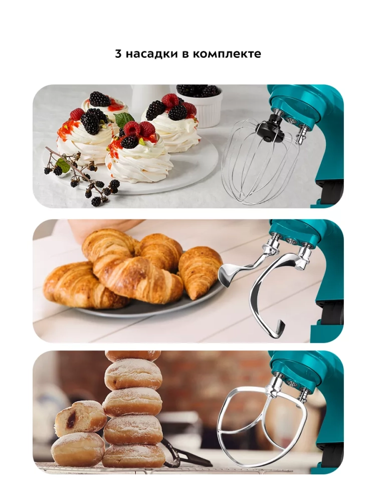 Венчик служит для взбивания яичных белков, сливок, замешивания жидкого теста. Насадка для смешивания используется для негустых ингредиентов, приготовления картофельного пюре, томатной пасты, кондитерских смесей или теста для тортов. Большой и малый крюки для замешивания подойдут для замешивания густого теста.
