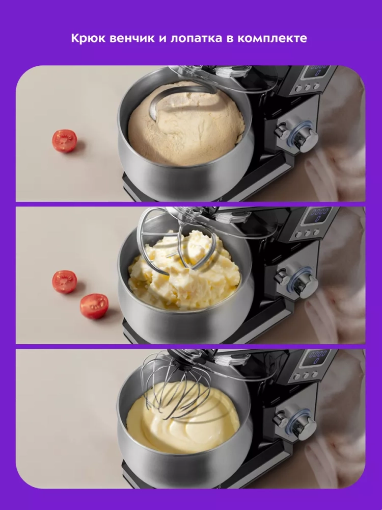 Планетарный миксер Kitfort КТ-3470 поможет вам смешать ингредиенты, взбить яичный белок или сливки, приготовить картофельное пюре, соус, крем, мусс, замесить жидкое тесто для блинов и крутое — для пельменей и пирогов. В комплекте есть три насадки.
