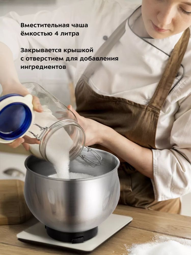 Миксер оснащен большой чашей емкостью 4 литра. Чаша изготовлена из нержавеющей стали, она прочная, и в ней можно смешивать даже горячие ингредиенты.