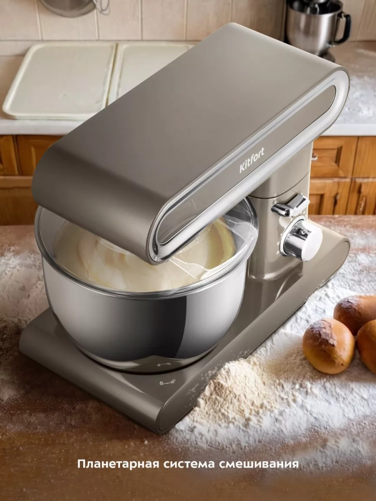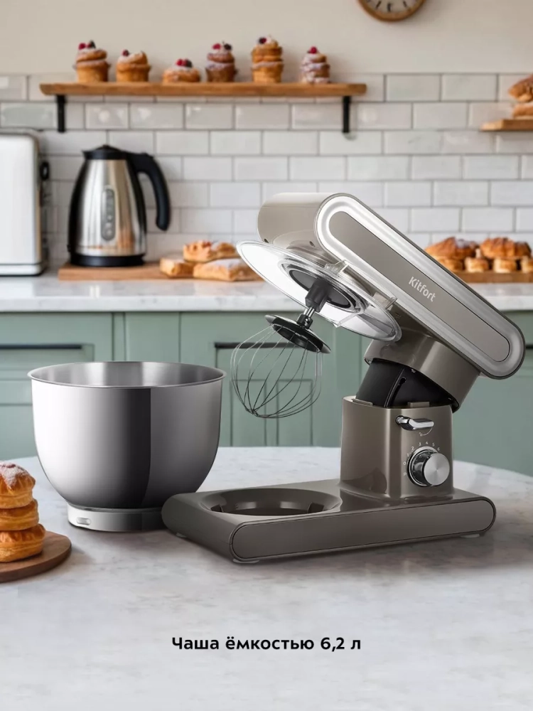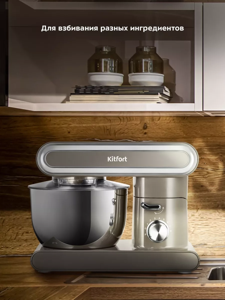 Планетарный миксер Kitfort КТ-3477 поможет вам смешать ингредиенты, взбить яичный белок или сливки, приготовить картофельное пюре, соус, крем, мусс, замесить жидкое тесто для блинов и крутое — для пельменей и пирогов. В комплекте миксера имеется три насадки.