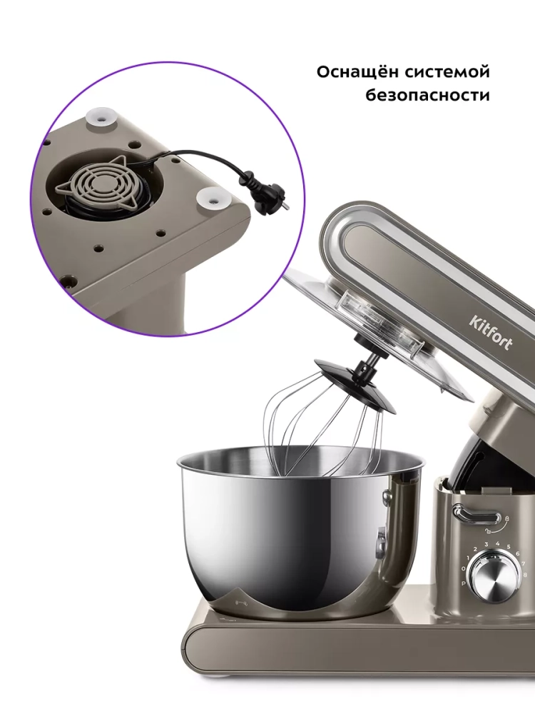 Миксер оснащен большой чашей емкостью 6,2 литров. Чаша изготовлена из нержавеющей стали, она прочная, и в ней можно смешивать даже горячие ингредиенты. Чаша закрепляется на моторном блоке и укомплектована защитной крышкой с отверстием. Крышка предотвращает разбрызгивание ингредиентов при замешивании. Через загрузочное отверстие в крышке можно добавлять ингредиенты во время работы, не выключая миксер и не поднимая моторный блок.
