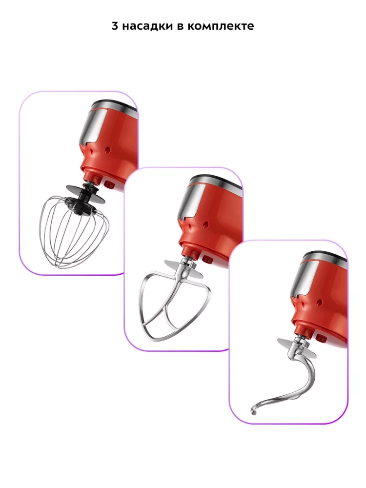 В комплекте к миксеру идут три насадки. Венчик служит для взбивания яичных белков, сливок, замешивания жидкого теста. Насадка для смешивания используется для негустых ингредиентов, приготовления картофельного пюре, томатной пасты, кондитерских смесей, теста для тортов. Крюк для замешивания подойдет для замешивания густого теста.