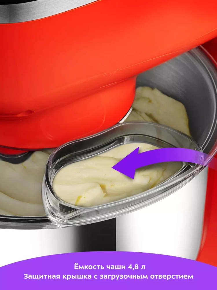 Миксер оснащен чашей емкостью 4,8 литра. Чаша изготовлена из нержавеющей стали, она прочная и в ней можно смешивать даже горячие ингредиенты. Чаша закрепляется на базе и укомплектована защитной крышкой с загрузочным отверстием. Крышка предотвращает разбрызгивание ингредиентов при замешивании. А через загрузочное отверстие можно добавлять ингредиенты во время работы, не выключая миксер и не поднимая моторный блок.