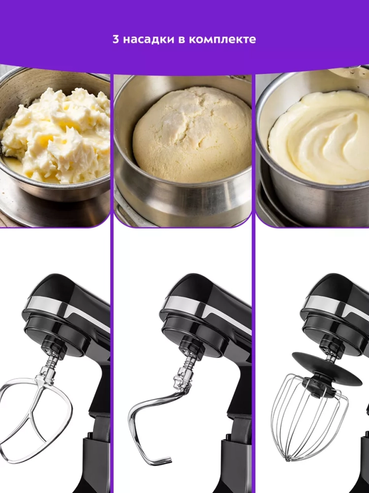 Венчик служит для взбивания яичных белков, сливок, замешивания жидкого теста. Насадка для смешивания используется для негустых ингредиентов, приготовления картофельного пюре, томатной пасты, кондитерских смесей или теста для тортов. Крюк для замешивания подойдет для замешивания густого теста.