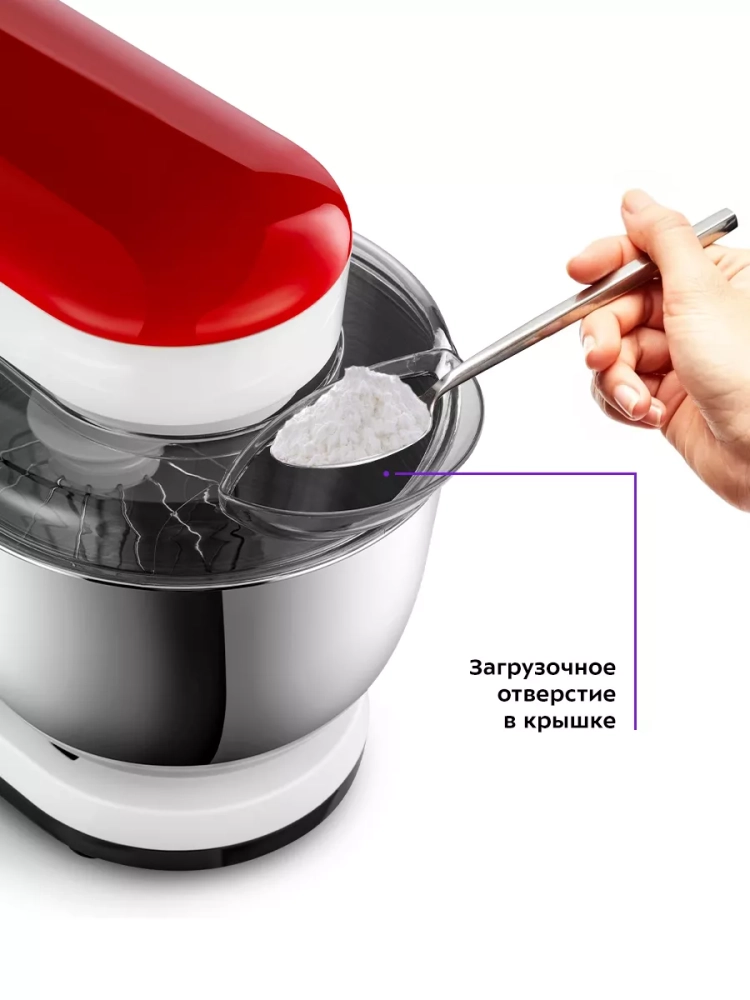Чаша изготовлена из нержавеющей стали, она прочная и в ней можно смешивать даже горячие ингредиенты. Чаша закрепляется на базе и укомплектована защитной крышкой с загрузочным отверстием. Крышка предотвращает разбрызгивание ингредиентов при замешивании. Через загрузочное отверстие можно добавлять ингредиенты во время работы, не выключая миксер и не поднимая моторный блок. Крышка выполнена из прозрачного пластика, что позволит вам наблюдать за процессом смешивания.