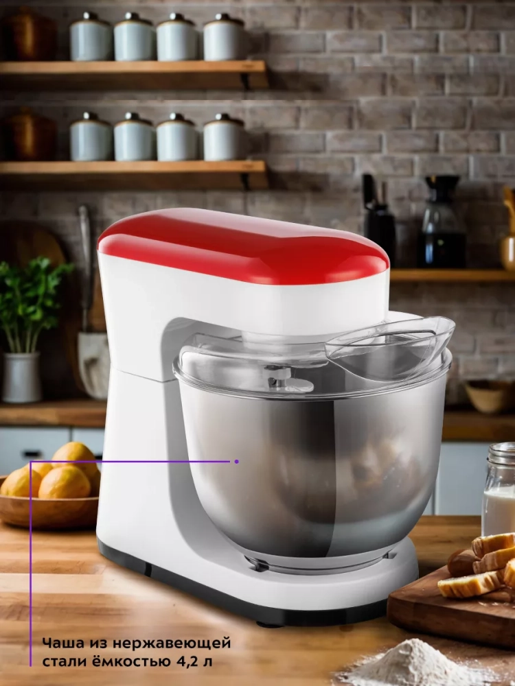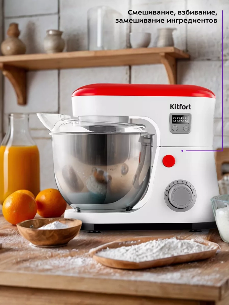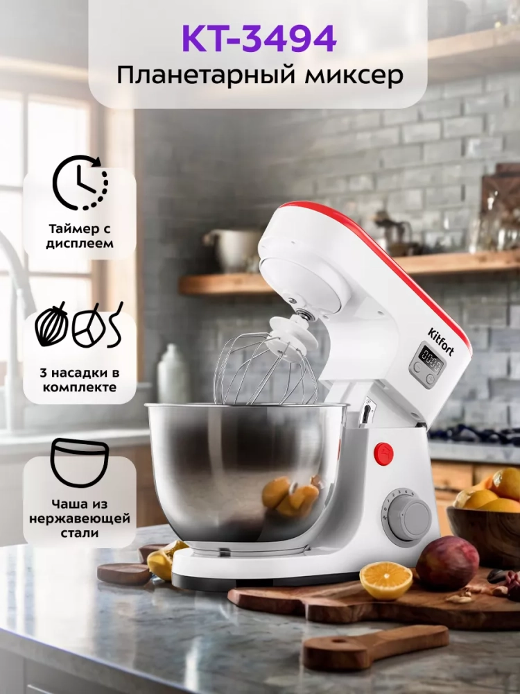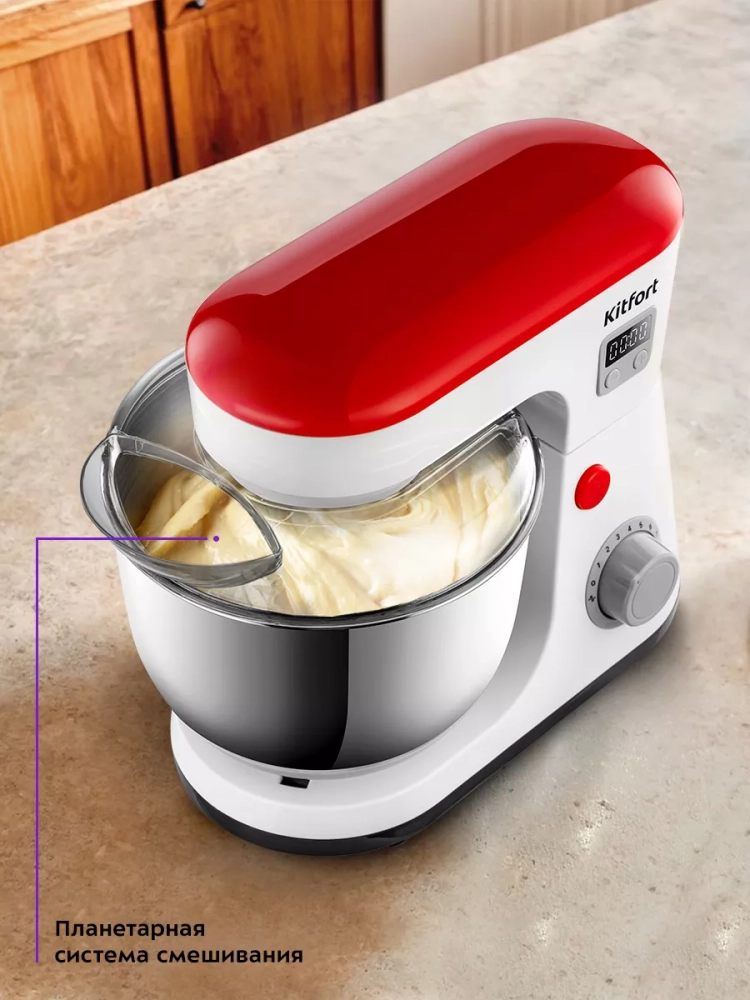 Многофункциональный планетарный миксер Kitfort КТ-3494 поможет вам смешать ингредиенты, взбить яичный белок или сливки, приготовить картофельное пюре, соус, крем, мусс, замесить жидкое тесто для блинов и крутое для пельменей и пирогов.