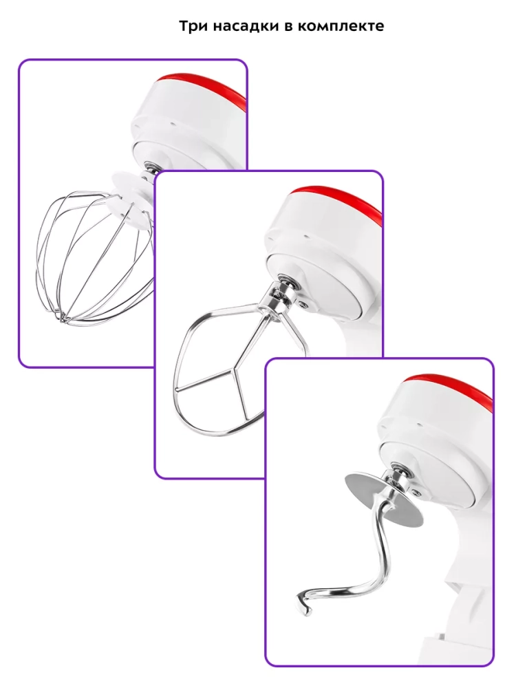 В комплекте к миксеру идут три насадки. Венчик служит для взбивания яичных белков, сливок, замешивания жидкого теста. Насадка для смешивания используется для негустых ингредиентов, приготовления картофельного пюре, томатной пасты, кондитерских смесей, теста для тортов или блинов. Крюк для замешивания подойдет для замешивания густого теста.
