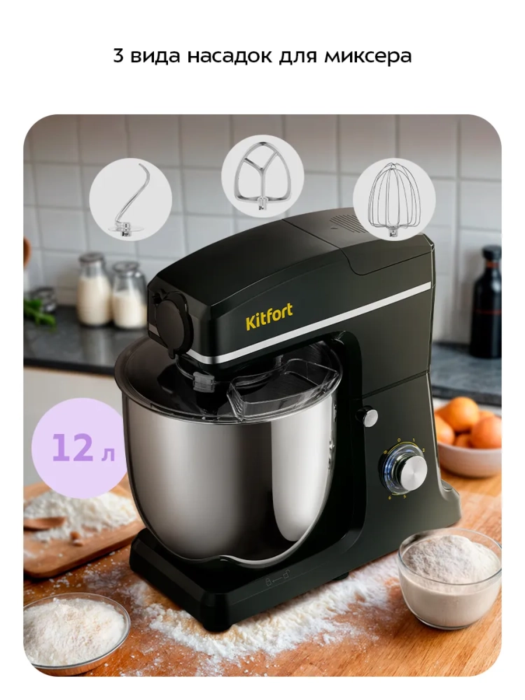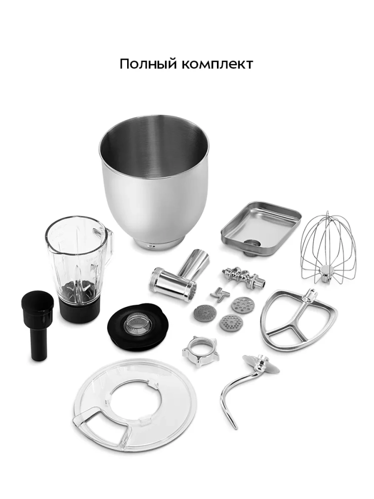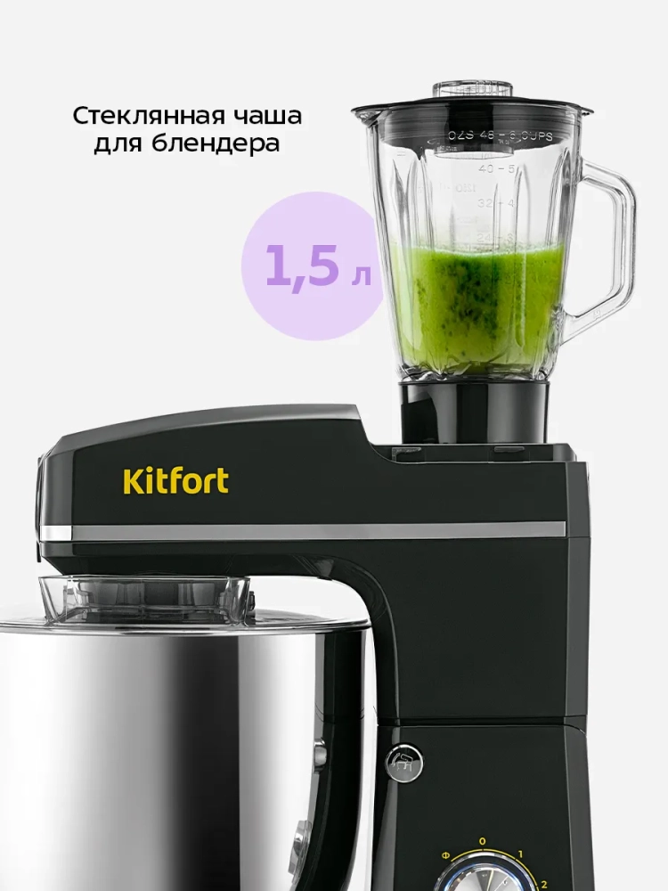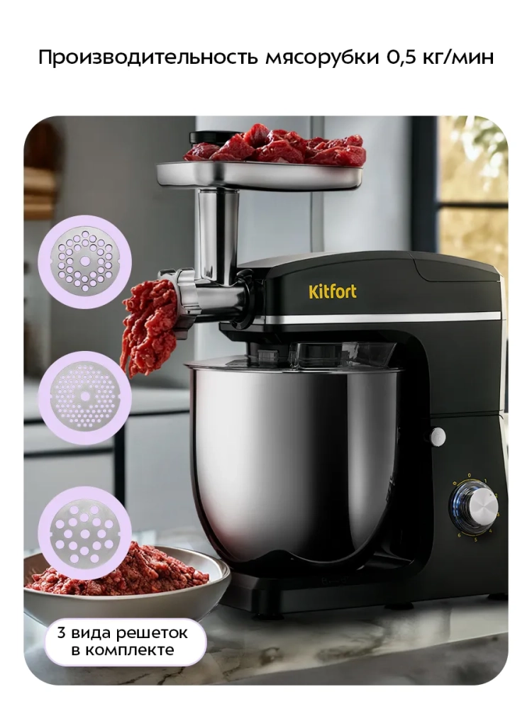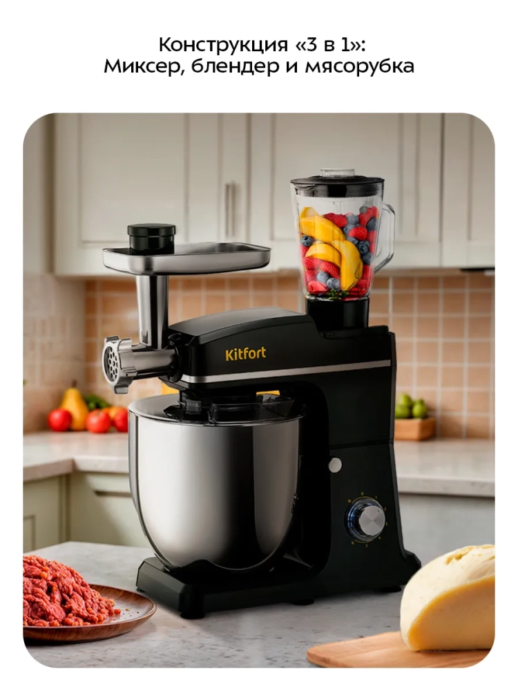 Планетарный миксер "3 в 1" Kitfort КТ-4427 поможет вам смешать ингредиенты, взбить яичный белок или сливки, приготовить картофельное пюре, соус, крем, мусс, замесить жидкое тесто для блинов и крутое тесто для пельменей и пирогов. Также он может перемолоть мясо на фарш и смешать фруктовые и фитнес-напитки, молочные коктейли, соусы и детское питание. В комплект входят мясорубка и блендер, что превращает эту модель в универсальную кухонную машину «3 в 1».