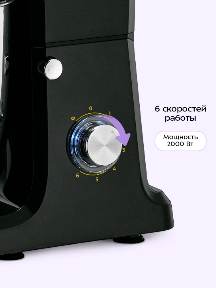 При включении миксера скорость вращения регулируется, чтобы предотвратить разбрызгивание ингредиентов. У прибора 6 скоростей и режим «Подогрев». В режиме «Подогрев» чаша миксера будет подогреваться до 38 °С. Этот режим позволяет провести расстойку теста прямо в чаше миксера.